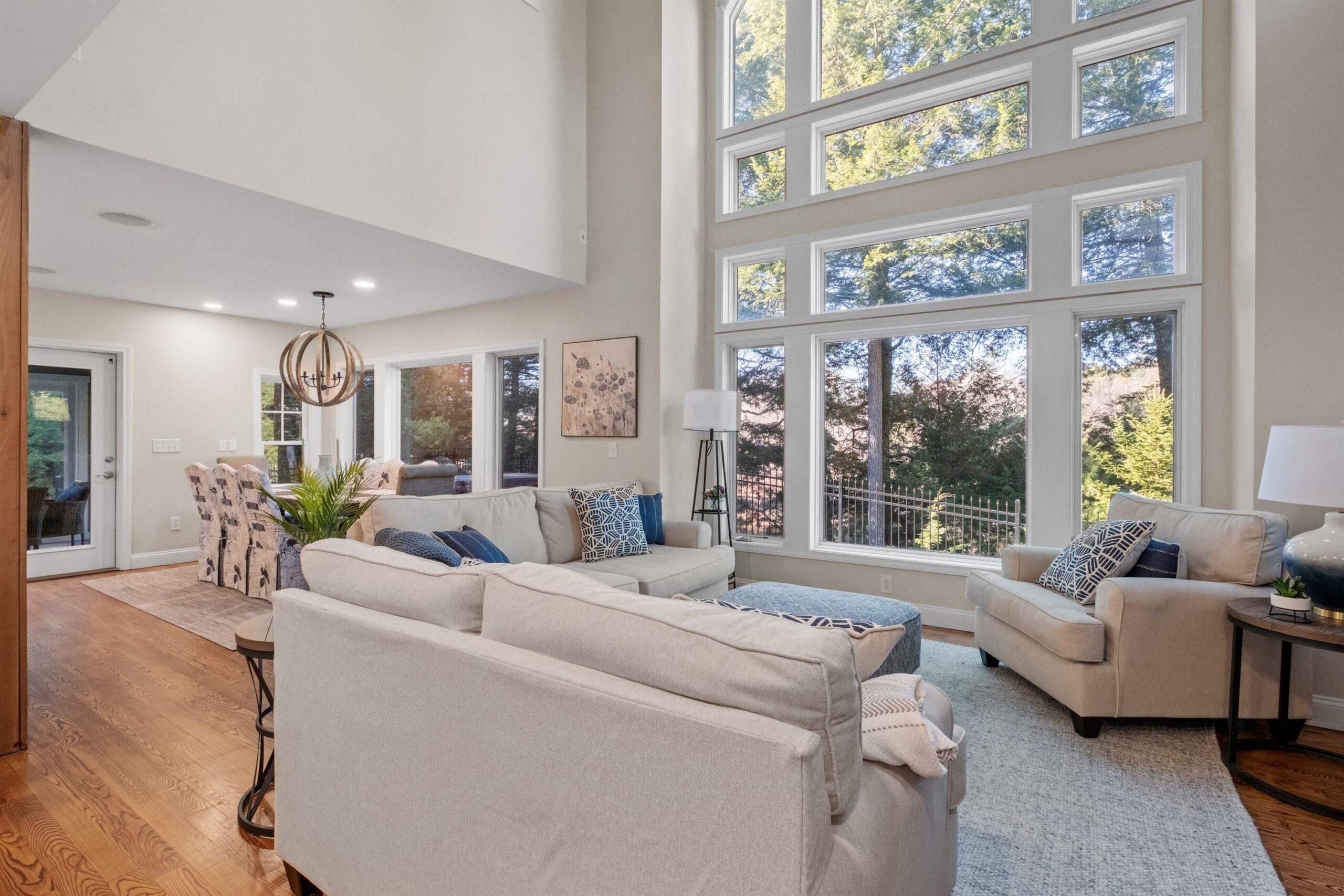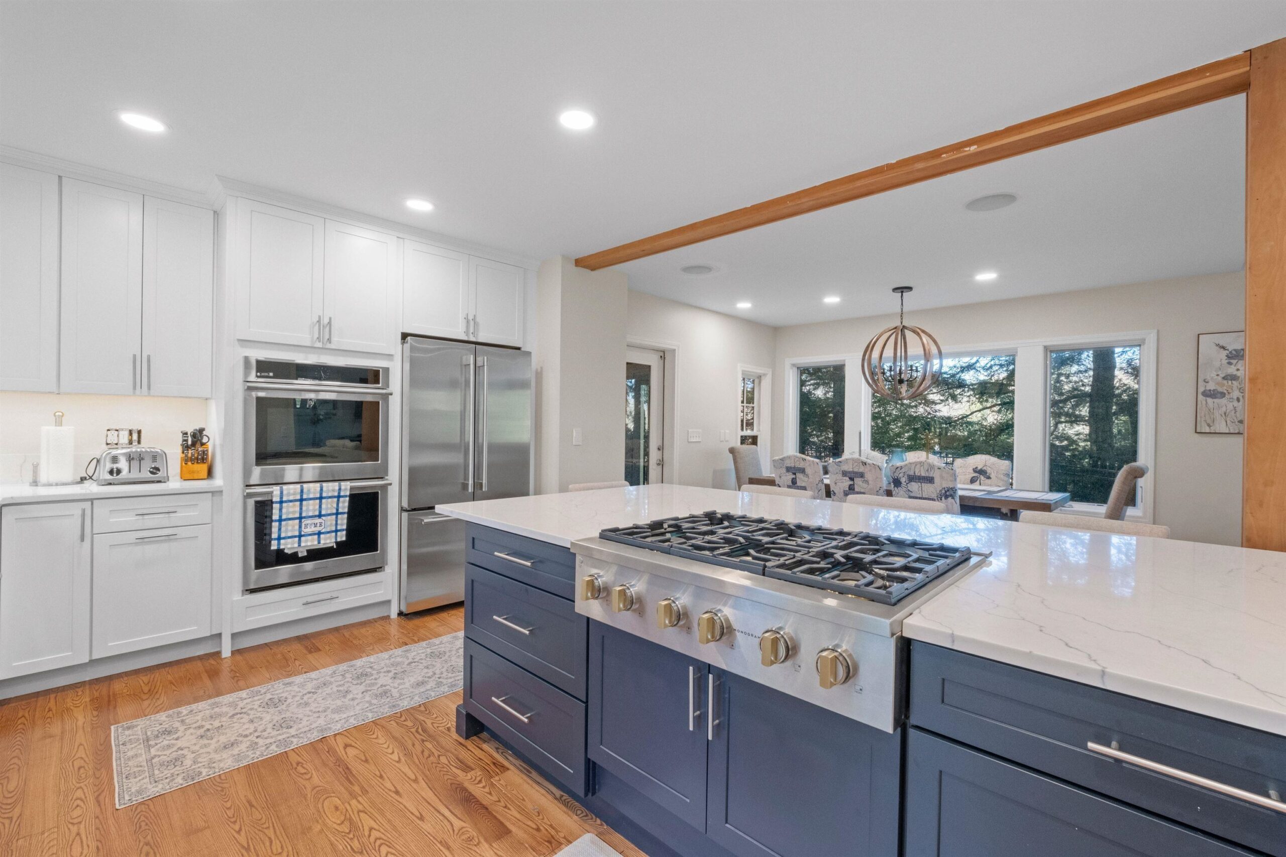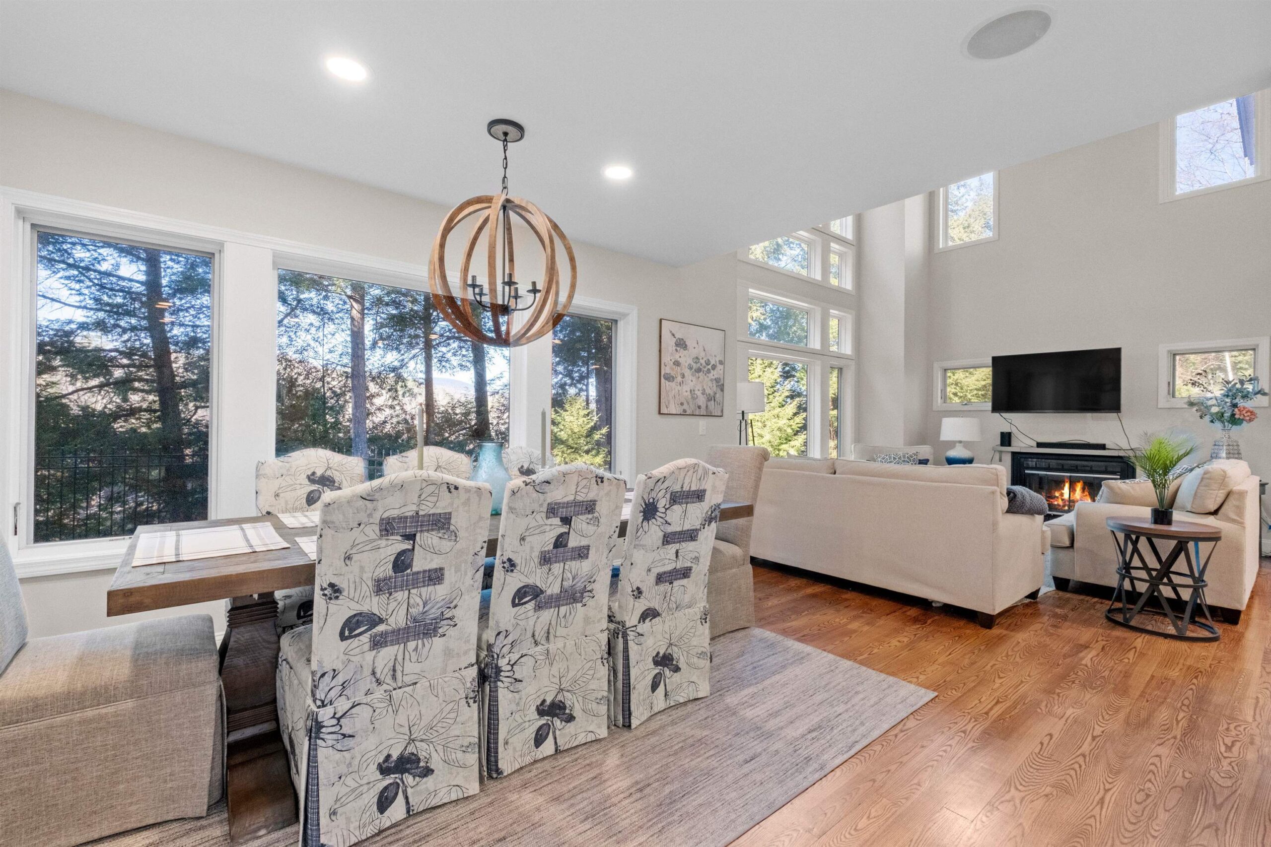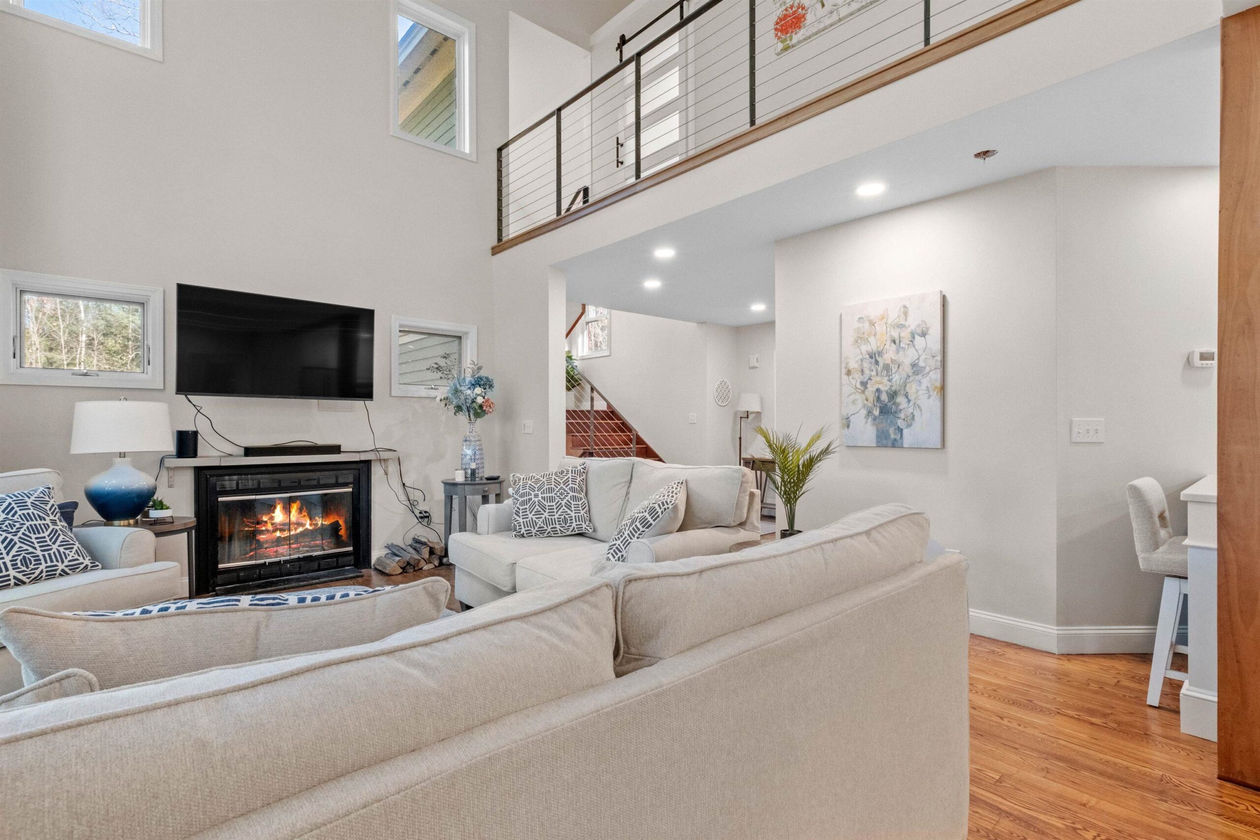 Discover the perfect blend of luxury, privacy, and resort living at 147 Pemi River Road. Nestled on nearly two serene acres in the prestigious Owl’s Nest Resort, this home offers Pemigewasset River access and optional resort-style amenities. Enjoy golf, tennis, pickleball, a fitness center, heated pools, and award-winning dining, with optional landscaping and snow removal services. The property’s charm and seclusion immediately stand out. A fully fenced yard ensures safety for pets and children, while the riverbank and grassy yard create a peaceful retreat. Inside, the home has been thoughtfully upgraded to blend comfort and modern style. The redesigned kitchen features high-end appliances, a coffee bar, and seating. The home offers four inviting bedrooms and three and a half updated bathrooms, including a new top-floor suite, offering flexibility for families or guests. Vaulted ceilings and large windows bathe the living area in natural light, while a wood-burning fireplace adds warmth. A sunroom, versatile loft, and spacious deck provide even more space to relax or entertain. Outside, a large stained concrete patio with a wood-burning fireplace and hot tub invites you to unwind while taking in serene river views. With its updates, privacy, and optional resort amenities, this home is ideal as a full-time residence or weekend retreat. Furniture available for purchase. HOA approved plans for detached 35x26 3-bay garage with living space above, giving you the option to expand.