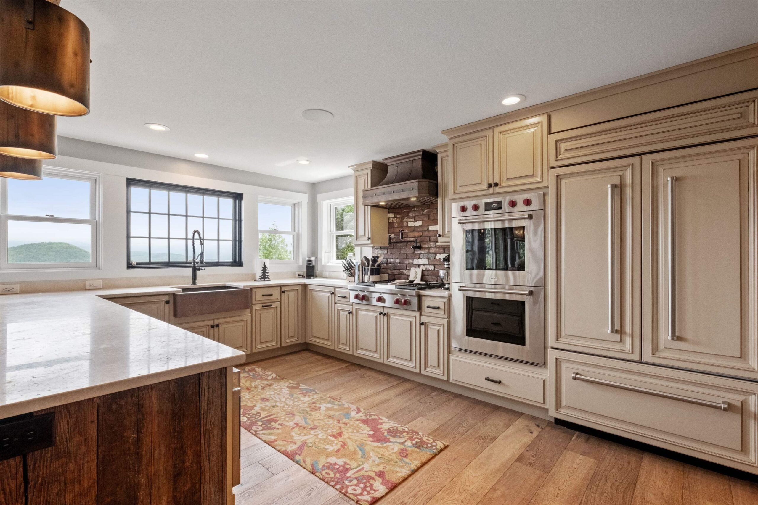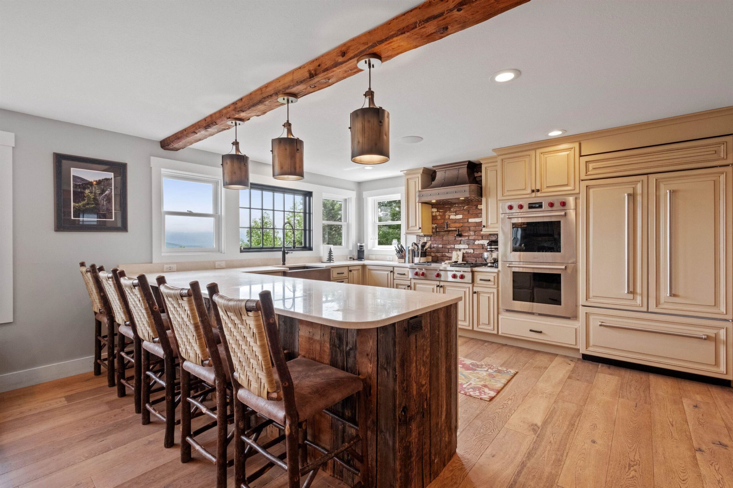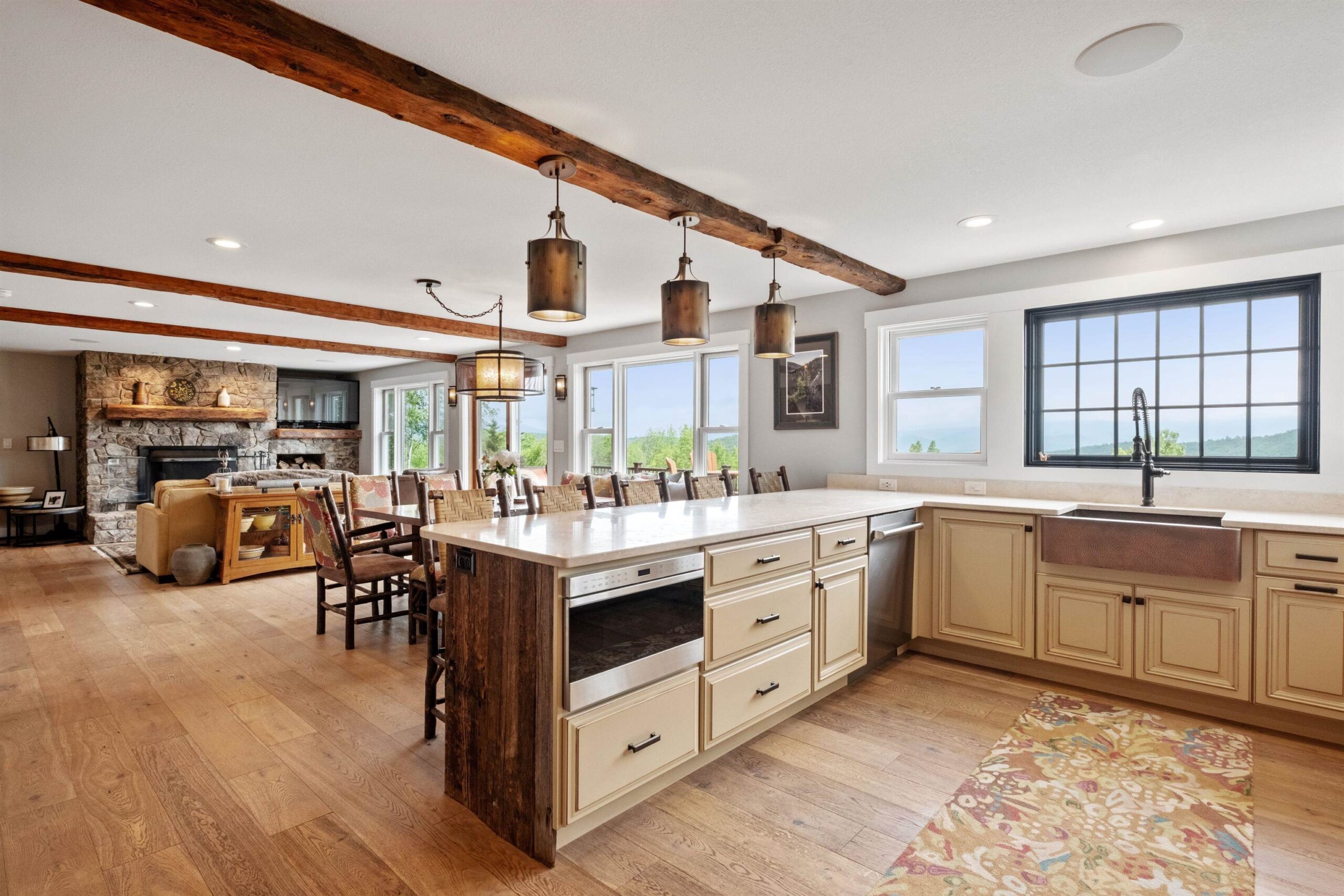 This extraordinary custom home offers the best views in the region—capturing the iconic Sandwich Range, Waterville Valley, and Franconia Notch through soaring windows that flood the interior with natural light. Designed to impress at every turn, the open-concept living space blends rustic sophistication with refined comfort. A dramatic fieldstone fireplace anchors the living room, while the chef’s kitchen stuns with Sub-Zero and Wolf appliances, Italian marble countertops, copper sink and hood, pot filler, custom cabinetry, and a built-in wet bar with wine fridge. The main level includes a designer mudroom, private office with custom barn doors, a heated screened porch with exposed beams and TV, and a beautifully appointed half bath with a barn-style vanity. Upstairs, the primary suite is a luxurious retreat with propane fireplace, spa-worthy bath, walk-in closet, and its own A/C split. Four additional bedrooms, 2 full baths, and laundry complete the upper level. The lower level was built for entertaining—featuring a game room, custom pool table, ultra-high-resolution home theater, two-seat bar, and ¾ bath. Outside, the wow continues: a Trex deck with granite bar, built-in stone grill, hot tub, fire pit, stone patio, and tiered gardens—all designed to showcase jaw-dropping mountain views. With a heated garage, whole-house generator, Sonos system, premium mechanicals, and being sold fully furnished—this is a rare opportunity to own one of the area's most remarkable homes.
